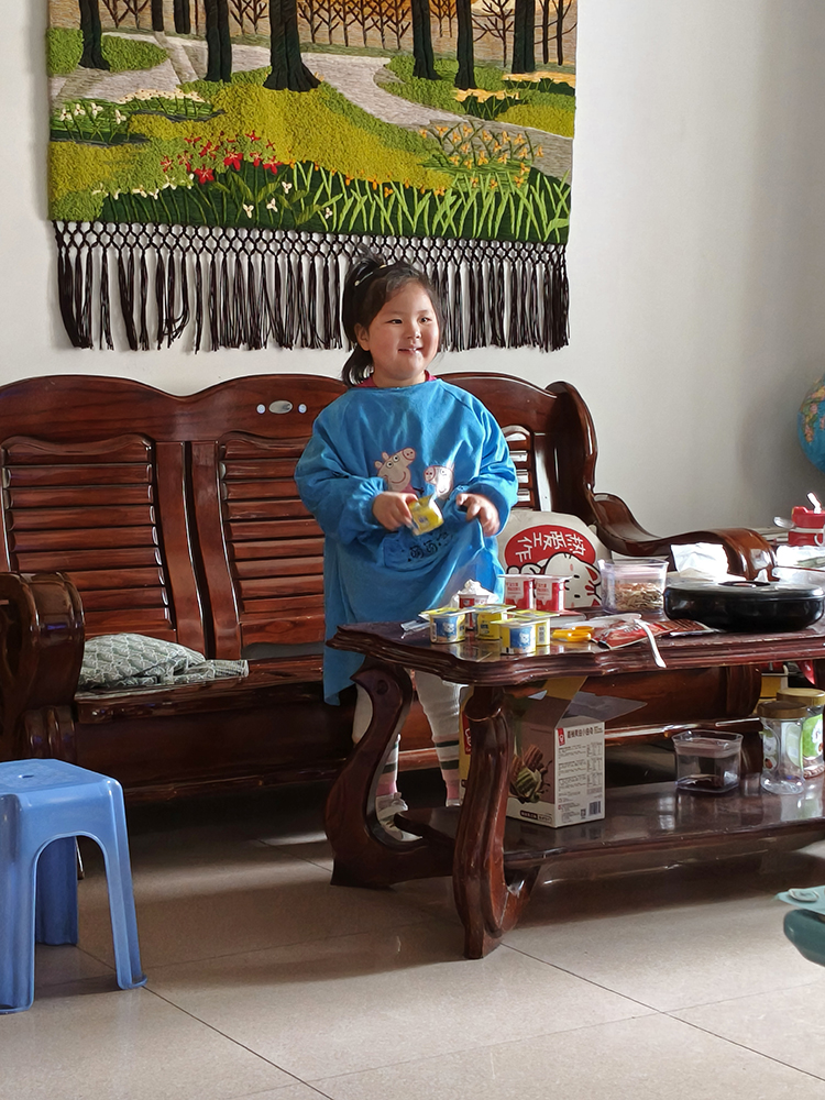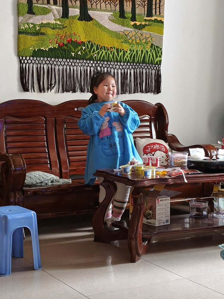午饭后,唱唱溜出餐厅,跑到客厅,喝酸奶,看动画片。