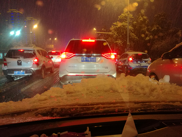下图为1月3日18:05左右的梅山南路临近龙河路口的路段,估计是先前天气预报说这一轮为暴雪,大家看到雪真的出现了,都急着把车开回家,路上比平时的上下班高峰还要堵。大家可以注意下我的车头,这就是首日积雪的大致厚度,不过从第二天开始,便大幅突破了这个记录。图片编号180845