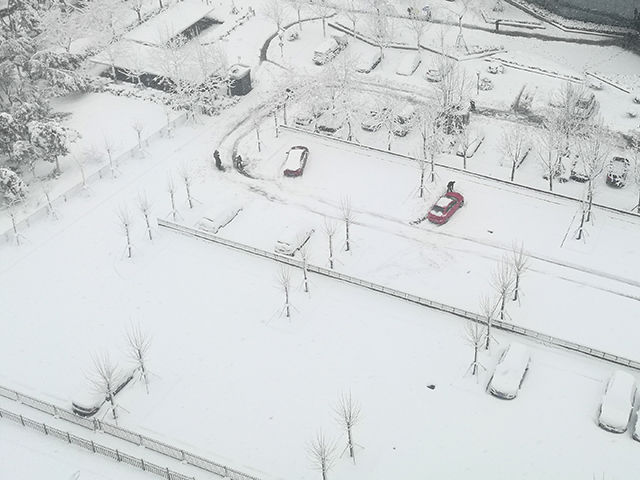 下图为1月3日17:40左右的建设大厦院子,可以明显看出,停放的汽车都已彻底“变白”,而次日早晨再俯瞰相同的位置,有些汽车干脆就“找不到了”。图片编号174145