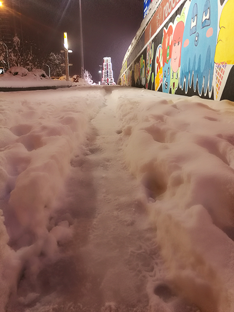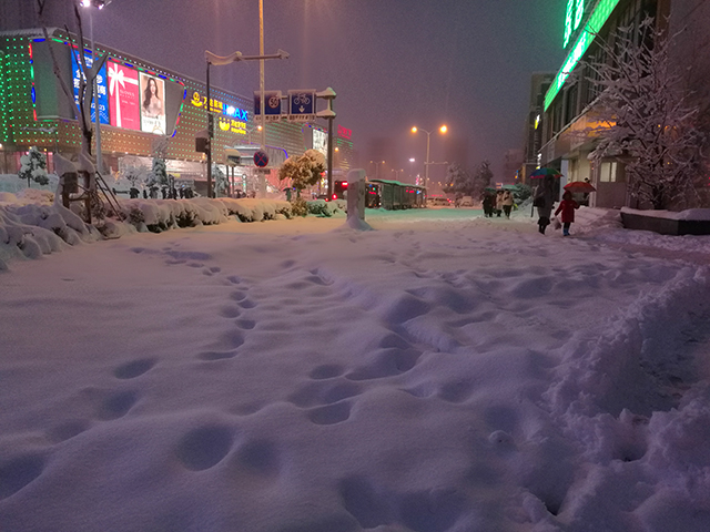 正如第二部分开头所说的,夜间的雪景也有着别样的风情,当五颜六色的路灯和景观灯照射到积雪上的时候,反射出来的光彩要比普通地面明亮的多,绚烂的多。