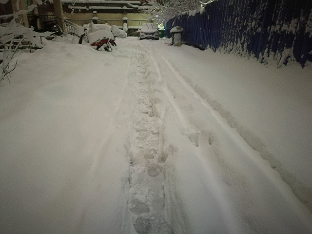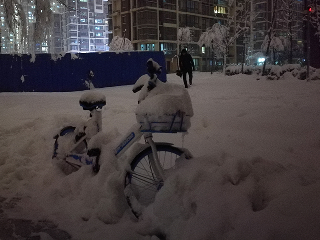 下图拍摄于1月4日,题目就叫做“风雪夜归人”吧。从图中“小蓝车”车轮露出来的比例,可以推算出积雪的厚度。图片编号184727