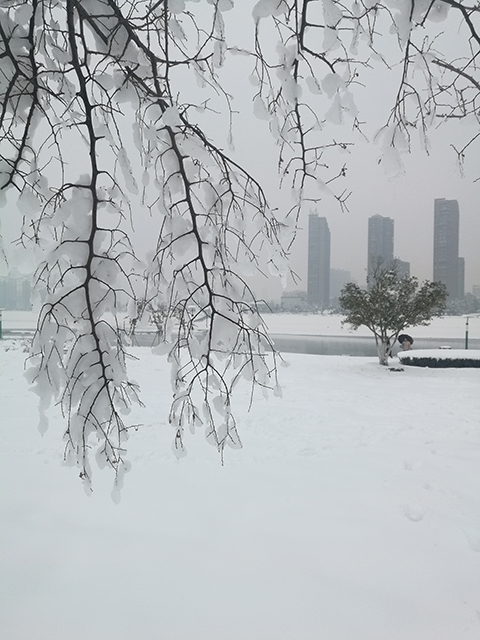 下图为站在月亮岛上,朝着西面眺望河西新区。经过四天,树枝上的雪已接近冰的状态。图片编号153158