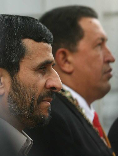 (1月13日,委内瑞拉总统查韦斯在首都加拉加斯的总统府举行仪式欢迎来访的伊朗总统艾哈迈迪-内贾德。内贾德于13日上午抵达委内瑞拉进行访问。当日,他与查韦斯签署了11项双边合作协议)