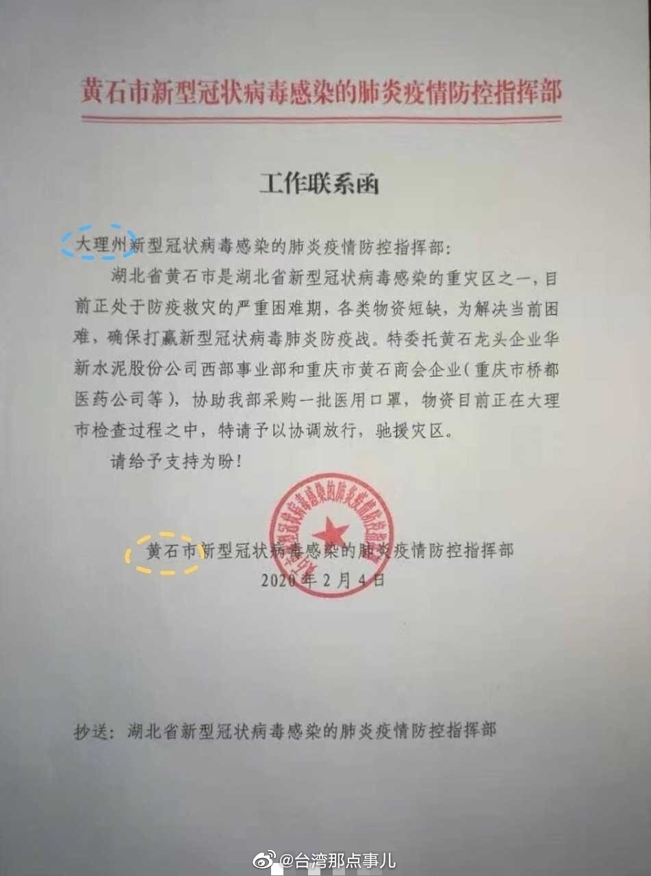然而,关于苍山洱海之间这个地方的更触目惊心的消息,在网上不断被曝光。如果说发往重庆,发往宁波(慈溪)的口罩被扣下来,是一种无赖行为的话,那么,发往最重疫区湖北(黄石)的口罩都敢抢?!不禁让人浮想联翩:在这个极其特殊的时期,大理州的某些领导是在作死么?是要践行“前方艰苦战斗,后方疯狂捅刀”么~~~