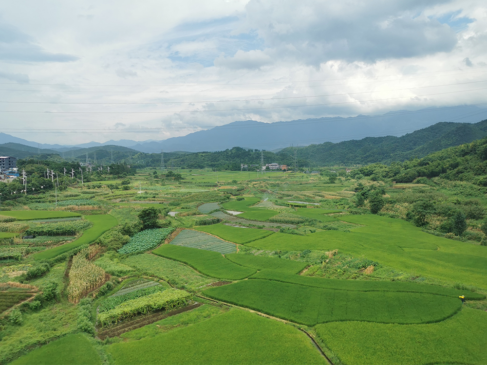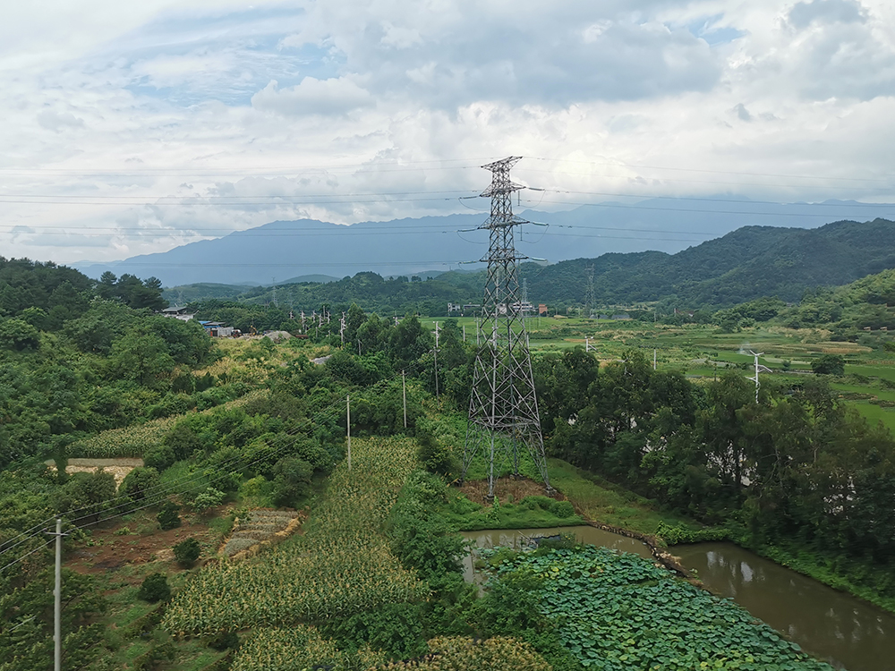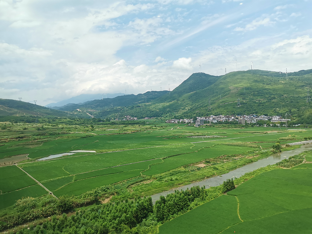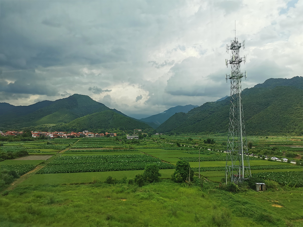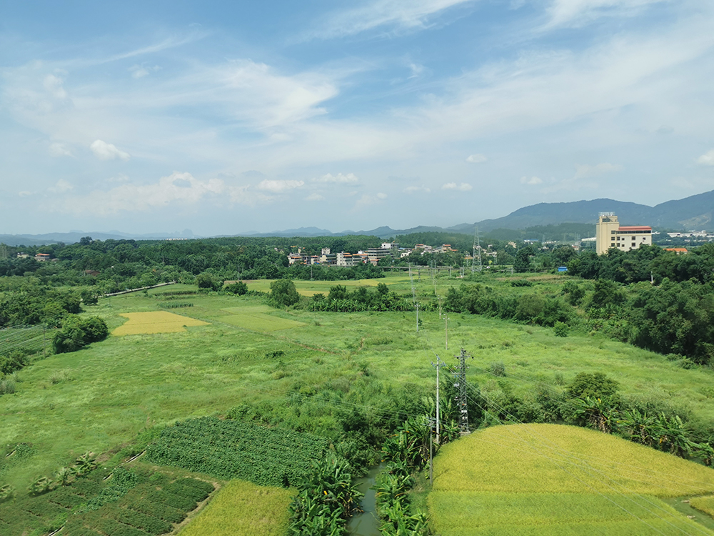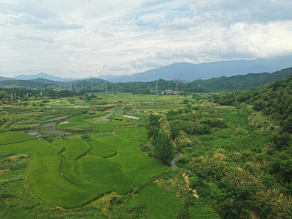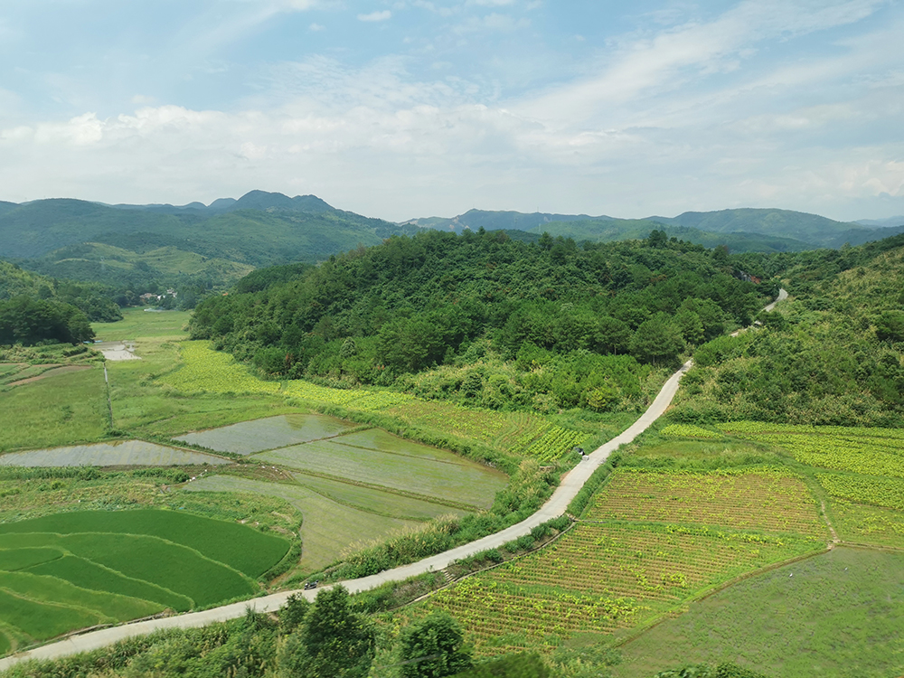 盛夏时节,五岭地区的群山之间雨水充沛,满目葱绿,再配上湛蓝的天空,让窗外的风景十分美丽。